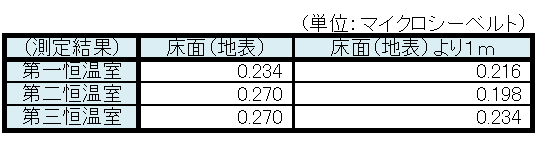 当社、福島工場は、福島第一原子力発電所より直線で48kmに位置し、既に震災の直接的影響は免れておりますが、2011年6月20日、工場内作業環境に於ける安全確保及び、加工商品への放射線の影響の有無を確認する為、福島県の協力により、福島工場の放射線レベルの測定を実施致しました。測定結果は以下の通りであり、全く問題ない旨、再確認しております。